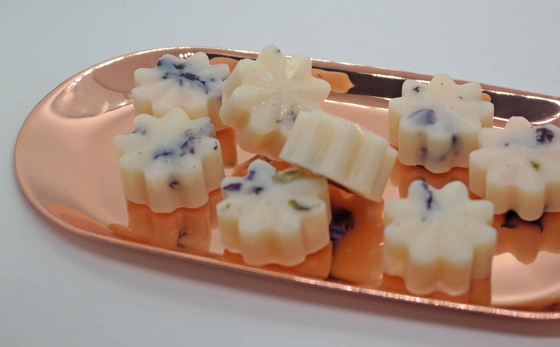Hand poured and elegantly shaped pieces of soy wax are infused with these fragrances and embellished with blue mallow leafs to bring some contrast to your wax melting experience.